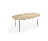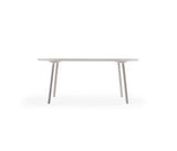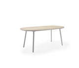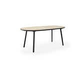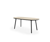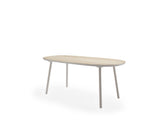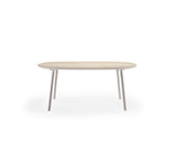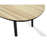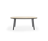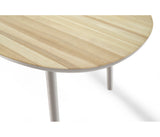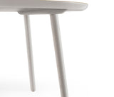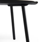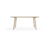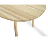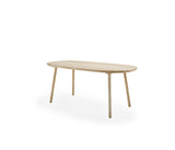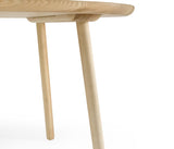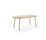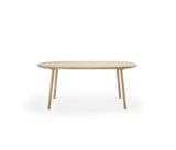 Cada pata tiene su propia base debajo de la mesa, lo que hace que la mesa sea lo suficientemente fuerte como para servir a las generaciones venideras. El contorno redondeado de la mesa está diseñado para crear un ambiente acogedor y confortable para quienes se sientan a su alrededor. La mesa está disponible totalmente barnizada (en la versión de fresno natural) o con una pátina de diferentes vibrantes colores a elegir.