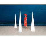 Una buena primera impresión es muy importante, pero lo difícil es mantenerla a la larga. La lámpara de exterior Pirámide tiene esta cualidad pues, a primera vista, su corte arquitectónico y sus 181 cm de altura resultan muy impactantes. La poética de la pieza se manifiesta, sin embargo, a medida que se pasa tiempo a su lado, transformándose en una escultura de luz con muy diversas alusiones más allá de la evidente, desde un faro a un fuego en la playa en una noche de verano.