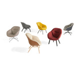 Sillón giratorio con estructura aluminio pulido o lacado negro. Asiento tapizado soft con diferente tapizado el exterior de la carcasa. Disponible con o sin cojín.