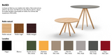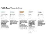 Se fabrican con mdf lacado, tablero bilaminado, chapa de roble o material compacto según el muestrario de materiales INCLASS. Los formatos disponibles son: 60, 70 y 80 cm de diámetro.