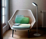 Lámpara de pie metálica con cabeza circular ajustable y difusor acrílico. La cabeza se desliza a través del vástago, se puede mover arriba y abajo y girarse hasta 160º. LED integrado y dimmer táctil en la cabeza.