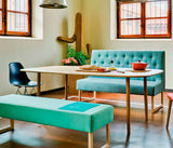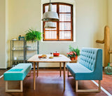 La adaptabilidad de esta bancada también viene dada por sus 5 bancos sin respaldo, sus 4 módulos y las 2 opciones de ángulo que ofrece para hacer rincón o esquina. Otro aspecto que la diferencia es la posibilidad de elegir el respaldo liso o con botones. Menú se puede tapizar tanto en tela, piel o piel sintética. La unión entre módulos con pata de metal y pata de madera se realiza mediante carracas. Los módulos con zócalo van sueltos.