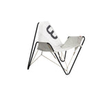 La butaca Trimmer posee una silueta de tubo de acero formando una figura de tres pies con otros tres apoyos que consiguen "trimar" la tela junto con la estructura usando únicamente un cabo tensado de polipropileno. El asiento está fabricado con tela de vela recuperada. Certificado ignífugo del tejido.