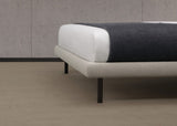 La cama se ofrece con tres tipos de construcción: con base suspendida, con la base tapizada hasta el suelo o con base contenedor. El cabecero también se ofrece como pieza independiente.