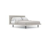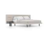 El cabecero, muy mullido, se extiende a los lados de la cama para conformar las mesillas que, como el sofá de la misma familia, tiene detalles de madera de roble entre los que integra un punto de luz a cada lado.