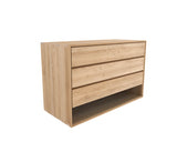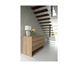 Esta cómoda está hecha de roble macizo y cuenta con tres cajones.