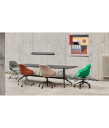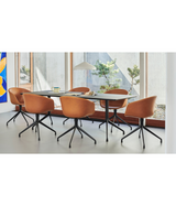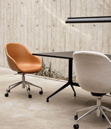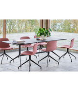 About A Table comparte la versatilidad general y el lenguaje de diseño como el resto de la familia. La mesa presenta el mismo marco con recubrimiento de polvo que muchas de las sillas de la serie, y las curvas orgánicas y los pies elevados transmiten una expresión de luz similar. Las mesas están disponibles con tableros redondos o rectangulares, con el tablero redondo descansando sobre un marco centrado, mientras que la versión rectangular tiene las patas colocadas en ambos extremos y tiene una construcción de barra transversal. About A Table está disponible en dos alturas y una amplia gama de dimensiones, lo que le permite crear una solución única para satisfacer sus necesidades.