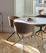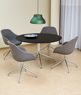 About A Table comparte la versatilidad general y el lenguaje de diseño como el resto de la familia. La mesa presenta el mismo marco con recubrimiento de polvo que muchas de las sillas de la serie, y las curvas orgánicas y los pies elevados transmiten una expresión de luz similar. Las mesas están disponibles con tableros redondos o rectangulares, con el tablero redondo descansando sobre un marco centrado, mientras que la versión rectangular tiene las patas colocadas en ambos extremos y tiene una construcción de barra transversal. About A Table está disponible en dos alturas y una amplia gama de dimensiones, lo que le permite crear una solución única para satisfacer sus necesidades.