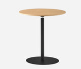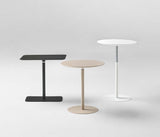 Mesa auxiliar regulable en altura con tapa de madera circular de Ø40cm y base de acero. BASES Y COLUMNA La base plana esta fabricada con chapa de acero . La columna central elevable incorpora ajuste de altura mediante cilindro de elevación neumático. El tubo elevable de la columna va acabado en cromo mate. Opcionalmente se fabrica la versión de columna central con altura fija. La base y la columna se pueden acabar en todos los acabados metálicos del muestrario INCLASS.