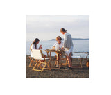 La mesa Dinghy B posee una estructura articulada fabricada con madera laminada contrachapada fenólica de abedul y barras cilíndricas de haya. Está barnizada con barniz para exteriores y toda la tornillería es de acero inoxidable. El sobre está hecho de resina con fibra de vidrio con tela de vela recuperada en su interior.