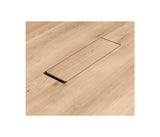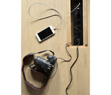 Mantiene los cables y cargadores fuera del campo visual gracias a una caja de madera que se encuentra debajo de la parte central de la mesa.