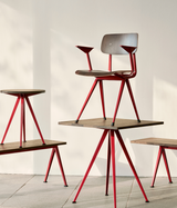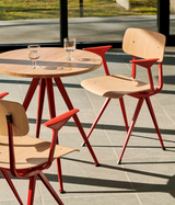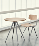 Diseñada para ser funcional, liviana y resistente, la mesa de centro Pyramid cuenta con un tablero redondo de roble y patas delgadas de chapa de acero que se inclinan hacia afuera, creando una expresión funcional y ordenada. Originalmente creada por Wim Rietveld mientras trabajaba en Ahrend en la década de 1950, la colección de acero recortado ha sido relanzada por HAY junto con Ahrend. La mesa viene en diferentes tamaños y es adecuada para su uso en una amplia variedad de contextos de restaurantes y cafés. Todos los modelos están disponibles en varios acabados de madera y colores base que se pueden coordinar con la Silla Result.