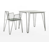 Esta mesa metálica completa la colección Rambla; está fabricada con los mismos materiales que la silla y es ideal para terrazas, porches y como mesa de jardín.