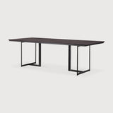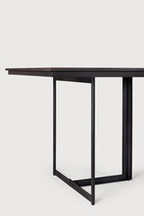Está fabricada en teca maciza marrón oscuro y cepillada, con certificación FSC y acabado barnizado sobre una base de patas de metal negro.
