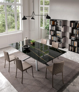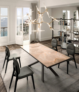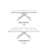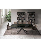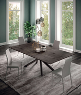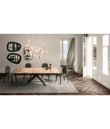 La mesa de comedor extensible 4x4 de Ozzio Italia, de varias dimensiones de estructura metálica con revestimiento en bronce, grafito mate, patas regulables en altura, sobre y extensiones de madera, componen la nueva y
