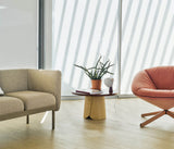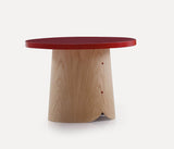 Tab son 2 banquetas con diferente altura y 4 mesas (resultado de combinar las dos alturas con los tres diámetros para las tapas). La base siempre es de chapa de castaño curvada y las tapas están disponibles en chapa de castaño y en un amplio abanico de lacados.