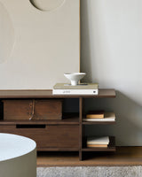 Cuenta con 2 cajones. El acabado de la parte posterior permite ubicarla de forma central en cualquier estancia.