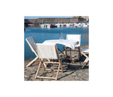 La Silla Crew posee una estructura articulada fabricada con madera laminada contrachapada fenólica de abedul y barras cilíndricas de haya. Está barnizada con barniz para exteriores y toda la tornillería es de acero inoxidable. El asiento está hecho con tela de vela recuperada. Certificado ignífugo del tejido.