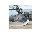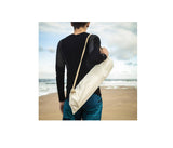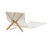 Está original silla de playa está fabricada con velas recuperadas y una estructura articulada de madera laminada contrachapada fenólica de abedul y barras cilíndricas de haya. Está barnizada con barniz para exteriores y toda la tornillería es de acero inoxidable. Certificado ignífugo del tejido.