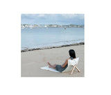 Esta silla posee una estructura que se clava en la arena y sostiene la tela formando un respaldo, manteniendo el resto de la tela extendida lo que permite que nos sentemos protegidos de la arena. Al ser plegable y ligera es muy práctica y cómoda de usar.