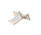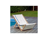 Está comodísima tumbona está fabricada con velas recuperadas y estructura de madera laminada contrachapada fenólica de abedul y barras cilíndricas de haya. Está barnizada con barniz para exteriores y toda la tornillería es de acero inoxidable. Certificado ignífugo del tejido.
