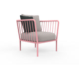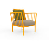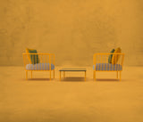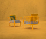 Esta colección desnuda, sincera y audaz juega con la geometría y los colores vivos, que pueden ser aplicados tanto en el termolacado del marco como en el tejido de sus generosos cojines. Y es que el componente cálido y textil juega un importante papel suavizando su apariencia formal, aportando confort desde la cercanía y permitiendo, a su vez, enormes posibilidades de personalización.