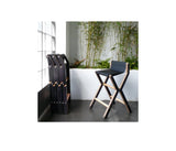 El taburete Ris posee una estructura articulada fabricada con madera laminada contrachapada fenólica de abedul y barras cilíndricas de haya. Está barnizada con barniz para exteriores y toda la tornillería es de acero inoxidable. El asiento está hecho con tela de vela recuperada. Certificado ignífugo del tejido.