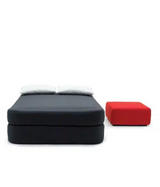 El puf Zoom transformable amplía el espacio al estilo de Giulio Manzoni (2009): es un asiento complementario de pequeñas dimensiones y con un aspecto versátil y atemporal, pero la carcasa de soporte en resina y espuma de poliuretano contiene una verdadera cama doble.