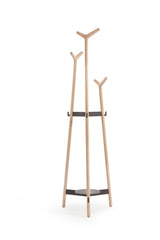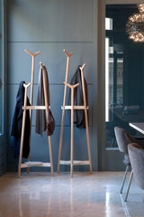 Con la voluntad de convivir en espacios contemporáneos y zonas más nobles de espacios singulares o clásicos, este perchero de pie del estudio Lagranja propone un perchero de madera de roble práctico y funcional. La disposición de las perchas de madera, de formas suaves, permite colgar todo tipo de roba y complementos a diferentes alturas.
