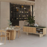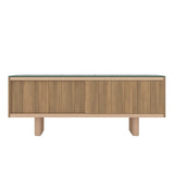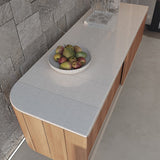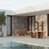Atrio es un aparador de exterior con puertas correderas que combina teca natural y cerámica. Diseñado por Mario Ruiz para la colección Ombra de Punt, ofrece almacenaje elegante en espacios cubiertos. Disponible en dos anchuras y dos alturas: versión baja con zócalo o elevada sobre patas de aluminio beige que añaden ligereza y proporción al mueble.