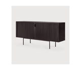El cuerpo del aparador está realizado en teca y las puertas en caoba teñida de marrón oscuro con un acabado barnizado. Dos medidas disponibles.