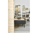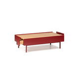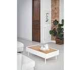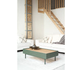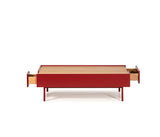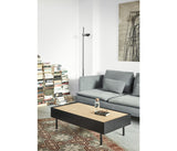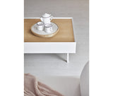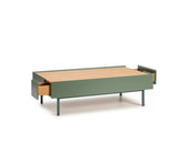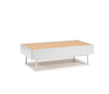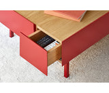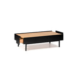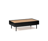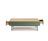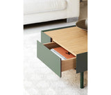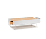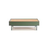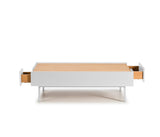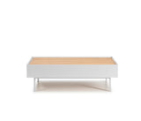 La mesa de centro Arista dispone de una amplia superficie chapada en roble aportando un toque cálido y acogedor al espacio. Integra dos cajones en los laterales opuestos, proporcionando un espacio extra de almacenaje.