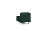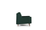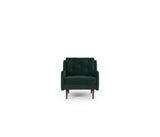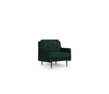 Un diseño clásico Mid Century con botoneras en asientos y respaldos, brazos tapizados y patas en madera maciza teñida de color oscuro .