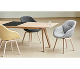 La silla AAC123 Soft combina la elegancia de la base de madera de cuatro patas con la suavidad y la calidez de la carcasa acolchada. La base de roble está disponible en diferentes acabados y la cubierta acolchada se ofrece en una variedad de opciones de tapicería, proporcionando una multitud de combinaciones de diseño.