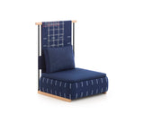 “Neri&Hu cuestiona la tipología del sofá. Una vez que el mueble se divide en sus componentes, asientos y alfombra se unen para convertirse en un mismo espacio. El componente del respaldo se basa en los orígenes de GAN como marca textil, haciendo referencia a los tradicionales telares manuales. La estructura vertical permite colgar tejidos hechos a mano como telón de fondo, y una correa sirve de soporte para los cojines móviles del respaldo. Los elementos de asiento son pufs, e incluyen una pequeña superficie de madera que puede actuar como una pequeña mesa auxiliar, cada uno intercambiable para lograr diversas configuraciones.”