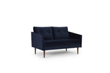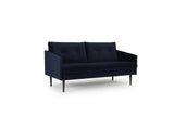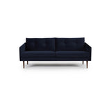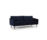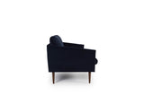 Sofá de diseño clásico mid century con brazos afilados tapizados y patas de estilete lacadas en color oscuro.