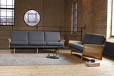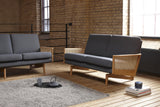 Un moderno sofá de estilo escandinavo y mid century modern con patas icónicas en roble lacado que unen el asiento y el respaldo de manera original, única y elegante.