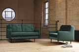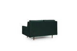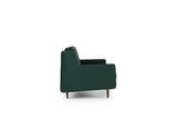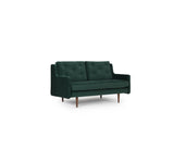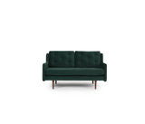 Un diseño clásico Mid Century con botoneras en asientos y respaldos, brazos tapizados y patas en madera maciza teñida de color oscuro .