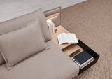 El sofá Silence, con su aparente sencillez y claridad, es pura calma a partir de un diseño concentrado en crear un sofá ultra mullido y cómodo. Brazos y respaldo tapizados forman el cuerpo envolvente del sofá. Los cojines, muy confortables y blandos, descansan sobre una base metálica lacada disponible en dos versiones, distintos colores y con detalles de madera de roble en un equilibrado juego de contrastes. Además, es posible integrar elementos auxiliares de apoyo y almacenamiento, así como iluminación y conexión USB.