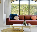 Tiptoe es también un sofá confortable e irresistiblemente hogareño. Su fondo reducido y la variedad de medidas para módulos y brazos, así como el gran número de piezas creadas para adaptarse a necesidades reales, acentúan el enfoque doméstico. La mezcla de fibra y visco-elástica de sus almohadas proporciona una sentada placentera. Las composiciones con chaises longues son perfectas para inundarlas de cojines.