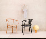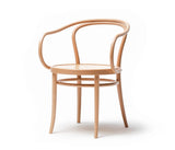 Este sillón con respaldo abierto proviene de la línea tradicional de productos de TON. Son típicas: su forma atemporal y su uso versátil. El asiento puede ser de madera contrachapada, tapizado o cubierto con caña.