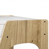 La estructura es metálica, mientras que la chapa de madera superior puede ser de roble o nogal.