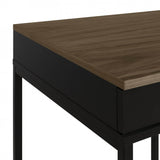 La estructura es metálica, mientras que la chapa de madera superior puede ser de roble o nogal.